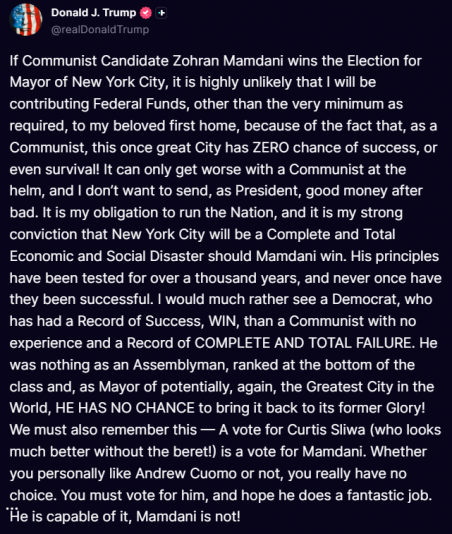 “If Communist Candidate Zohran Mamdani wins the Election for Mayor of New York City, it is highly unlikely that I will be contributing Federal Funds, other than the very minimum as required, to my beloved first home, because of the fact that, as a Communist, this once great City has ZERO chance of success, or even survival!”