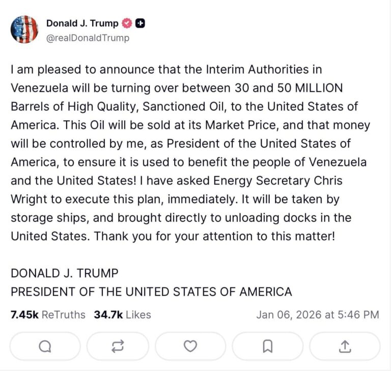I am pleased to announce that the Interim Authorities in Venezuela will be turning over between 30 and 50 MILLION Barrels of High Quality, Sanctioned Oil, to the United States of America. This Oil will be sold at its Market Price, and that money will be controlled by me, as President of the United States of America, to ensure it is used to benefit the people of Venezuela and the United States! I have asked Energy Secretary Chris Wright to execute this plan, immediately. It will be taken by storage ships, and brought directly to unloading docks in the United States. Thank you for your attention to this matter!