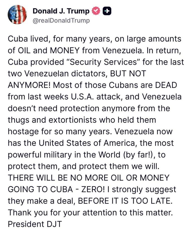 Cuba lived, for many years, on large amounts of OIL and MONEY from Venezuela. In return, Cuba provided “Security Services” for the last two Venezuelan dictators, BUT NOT ANYMORE! Most of those Cubans are DEAD from last weeks U.S.A. attack, and Venezuela doesn’t need protection anymore from the thugs and extortionists who held them hostage for so many years. Venezuela now has the United States of America, the most powerful military in the World (by far!), to protect them, and protect them we will.