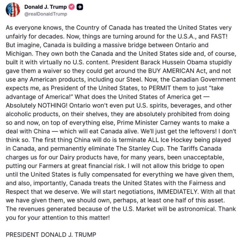 “As everyone knows, the Country of Canada has treated the United States very unfairly for decades. Now, things are turning around for the U.S.A., and FAST! But imagine, Canada is building a massive bridge between Ontario and Michigan. They own both the Canada and the United States side and, of course, built it with virtually no U.S. content. President Barack Hussein Obama stupidly gave them a waiver so they could get around the BUY AMERICAN Act, and not use any American products, including our Steel,” Trump said in a lengthy Truth Social post.