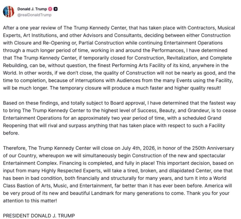 “Therefore, The Trump Kennedy Center will close on July 4th, 2026, in honor of the 250th Anniversary of our Country, whereupon we will simultaneously begin Construction of the new and spectacular Entertainment Complex. Financing is completed, and fully in place! This important decision, based on input from many Highly Respected Experts, will take a tired, broken, and dilapidated Center, one that has been in bad condition, both financially and structurally for many years, and turn it into a World Class Bastion of Arts, Music, and Entertainment, far better than it has ever been before. America will be very proud of its new and beautiful Landmark for many generations to come,” he added.