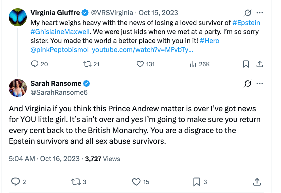 So in other words, Ransome was a certified nutcase. This didn’t stop her from getting a HarperCollins book deal, for a memoir touchingly entitled Silenced No More — nor was her nuttiness any impediment to being named as a plaintiff in some of the most consequential litigation against the Epstein estate, which ultimately led to the creation of the Epstein Victims’ Compensation Program, from which Ransome undoubtedly received a generous (tax-free!) payout — likely in the millions. Perhaps her good fortune in this regard stemmed from the perceived credibility she was afforded by her participation in Judge Berman’s wild August 2019 hearing. But as the years went by, things continued to unravel for Ransome, psychologically and otherwise. She turned on one of her high-powered lawyers, David Boies, declaring he had “betrayed” her for reasons she attempted to explain, but were increasingly indecipherable. She wrote in a 2023 affidavit: “I am infertile and have no children. I am damaged and broken because I was raped hundreds of times by Epstein while his enablers stood by and watched. My mother witnessed me die three times.” She started rebuking Boies not just as a craven betrayer, but as “Deablous,” a demon-like being. She sent rambling emails addressed to Joe Biden, Pope Francis, Vladimir Putin, Recep Erdogan, Mohammed bin Salman, among others, demanding to be granted a central diplomatic role in mediating the Ukraine war and Israeli-Palestinian conflict. She even did the unthinkable for any self-respecting “Epstein Survivor,” and condemned Virginia Roberts Giuffre: