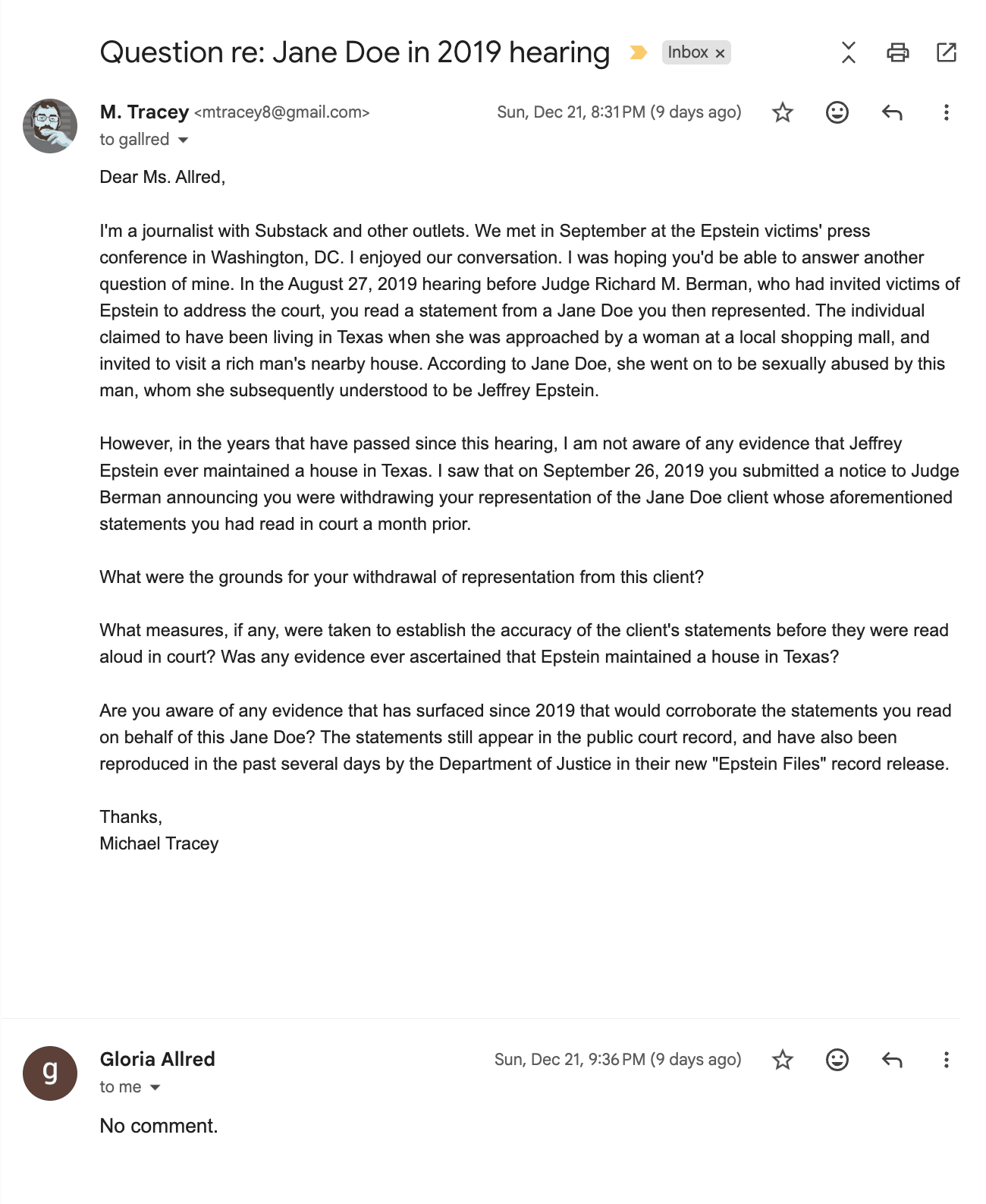 Given the expansive redactions that suffuse these latest “Epstein Files,” it’s difficult to discern whatever came of this “new client,” and if she was deemed of any “urgent” value by the Southern District of New York, which by then was in fervent pursuit of Ghislaine Maxwell, and perhaps other potential “co-conspirators” of Epstein. Either way, interfacing with the FBI and US Attorney’s Office could be profitably cited in any civil litigation Allred might subsequently bring.