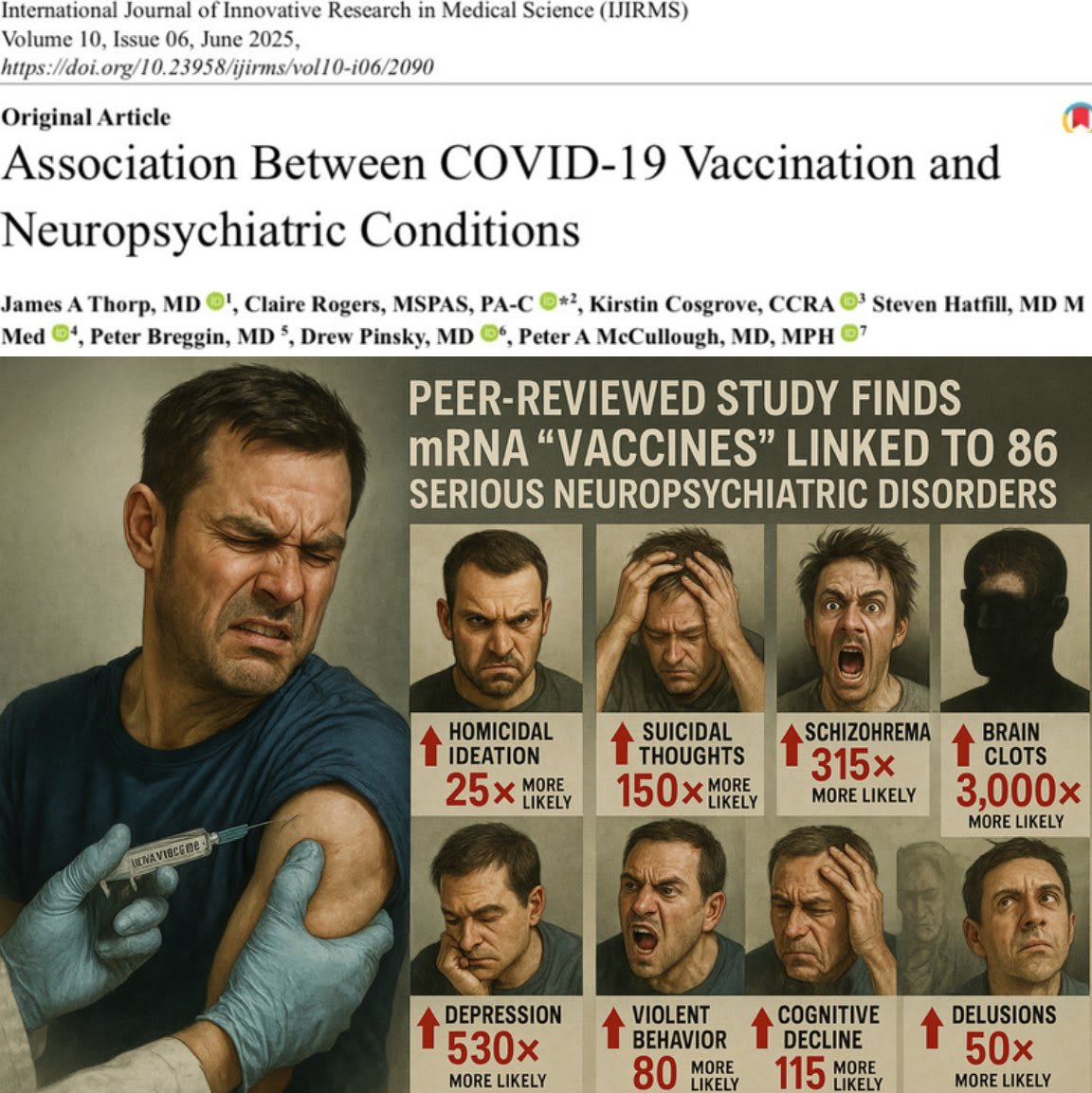 Thorp et al identified 86 serious neuropsychiatric disorders linked to COVID-19 vaccination — including cognitive impairment, dementia, schizophrenia, suicidal & homicidal thoughts, stroke, psychosis, depression, delusions & more.