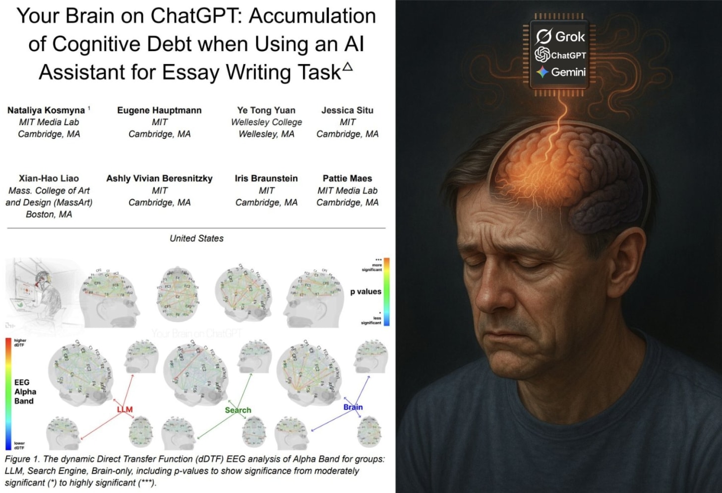 A recent MIT neurocognitive study—Your Brain on ChatGPT: Accumulation of Cognitive Debt when Using an AI Assistant for Essay Writing—shows that reliance on large language models like Grok, ChatGPT, and Gemini leads to measurable and lasting neural suppression.