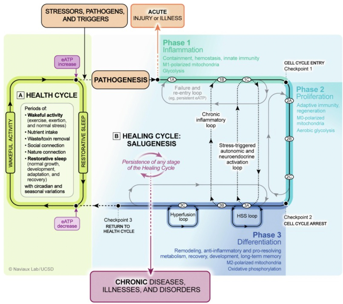 Note: Multiple persistent phases of this cycle can co-exist. For example, Naviaux argues that coronary artery disease results from the combination of local vascular inflammation (Phase 1), proliferation (Phase 2), and altered differentiation (Phase 3).