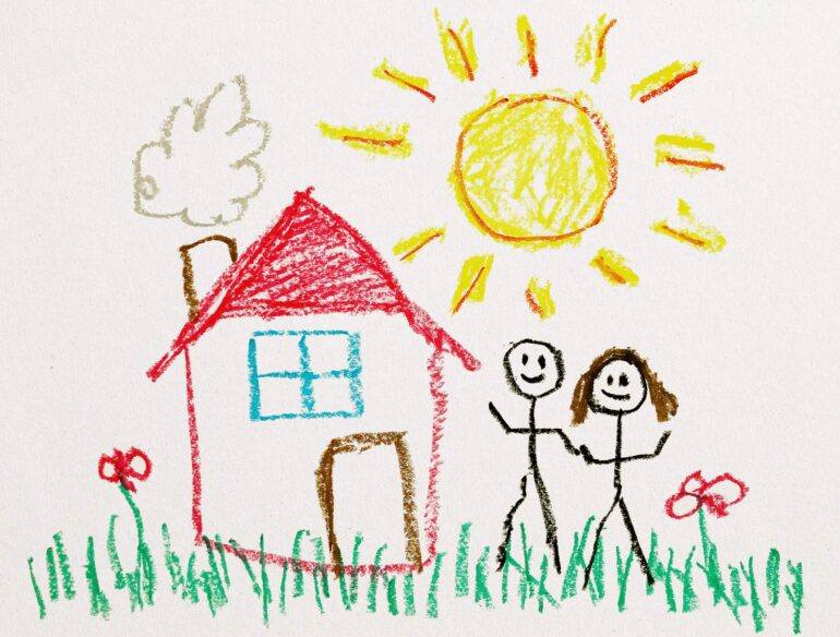 Four-window square house complete with chimney smoke, two stick parents, and a large sun.