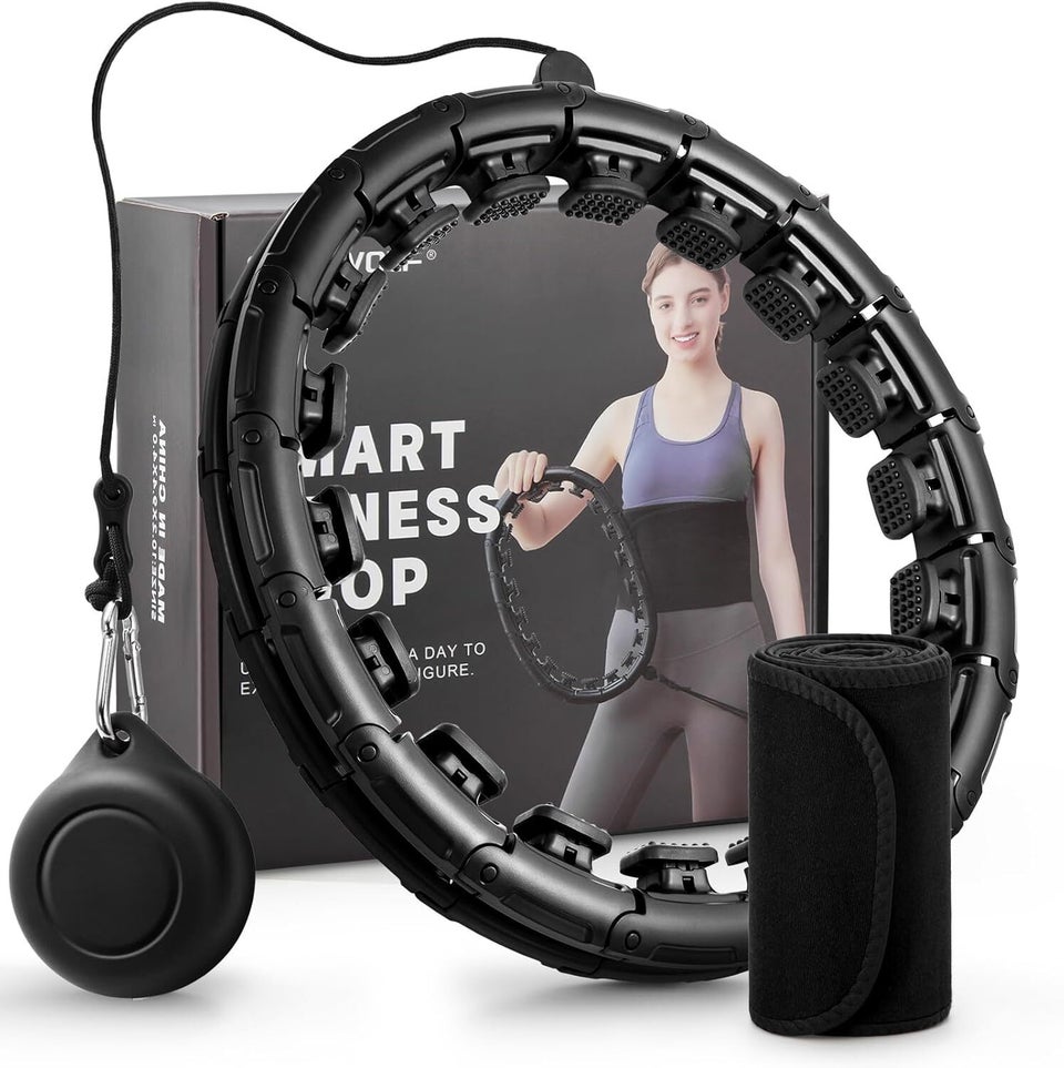 This weighted hoop functions a little differently: It has 32 detachable links that you can add or remove depending on your waist size, up to 65 inches. Then, you attach one of the soft weighted balls to the hoop, which slide along the track while you hoop. This model claims to be super quiet and comes with a waist trainer that you can use to pad your torso.