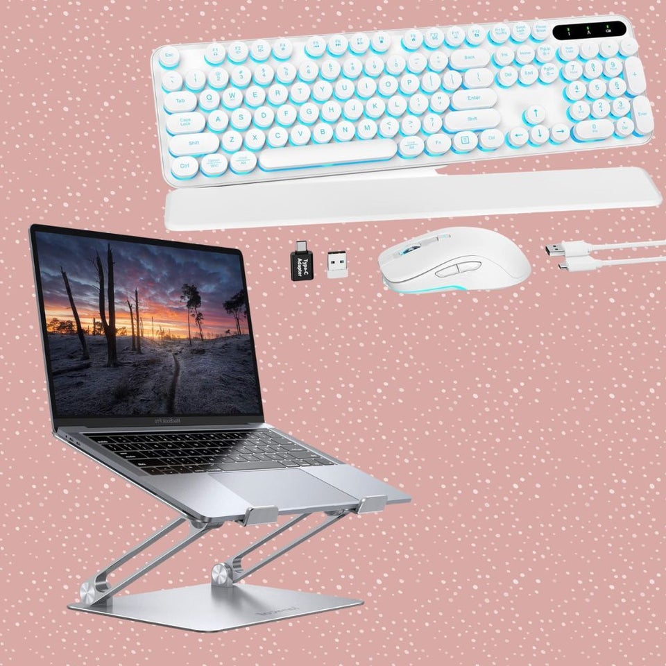 We found this laptop riser and Bluetooth keyboard and mouse set, which, together, offer ergonomic functionality for laptop users. The portable laptop riser, which is compatible with laptops up to 17.3 inches, can securely hold computers at a posture-appropriate angle.
