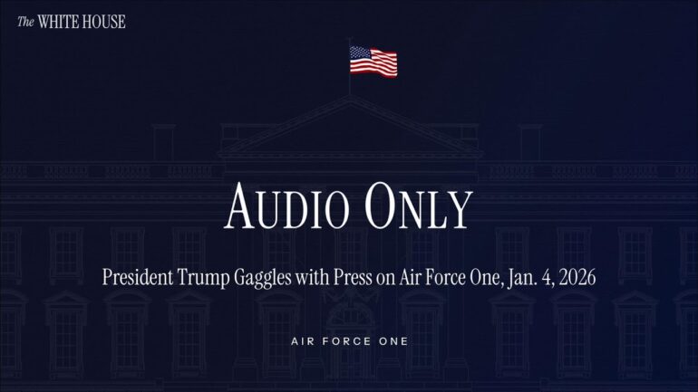 Home The White House WHITE HOUSE VIDEO: President Trump Gaggles with Press on Air Force One, Jan. 4, 2026 WHITE HOUSE VIDEO: President Trump Gaggles with Press on Air Force One, Jan. 4, 2026The White House·01/04/2026·1 min read·0 Air Force One source CLICK and SUPPORT CLICK and SUPPORT Join us on Telegram CLICK and SUPPORT CLICK and SUPPORT OnGo247 New 100% FreeSocial PlatformONGO247.COMGive it a spin!Sign Up Today YES OnGo247 New 100% FreeSocial PlatformONGO247.COMGive it a spin!Sign Up Today YES